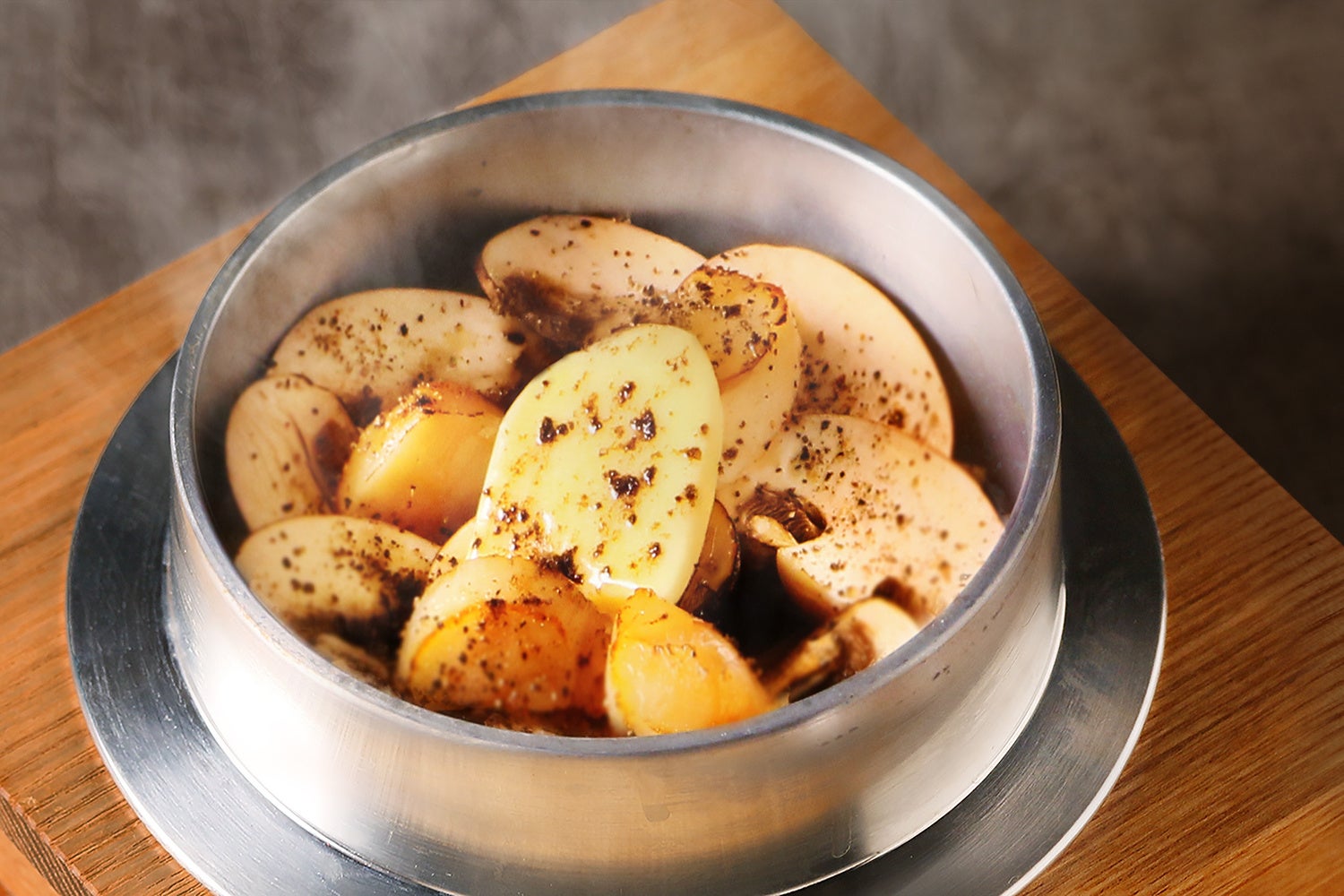 肉厚な舟形マッシュルームの旨みと香りがじんわりとしみ込む、きのこ好きにはたまらない一釜。そこへふっくら肉厚な北海道産帆立を合わせ、仕上げにバター、トリュフをまとわせることで豊かなコクと余韻を添えました。蓋を開けた瞬間に広がるきのことトリュフの芳しい香りは、冬の夜に似合う贅沢なごちそう。お酒とも相性のよい黒十らしい季節限定の香り高い釜飯です。