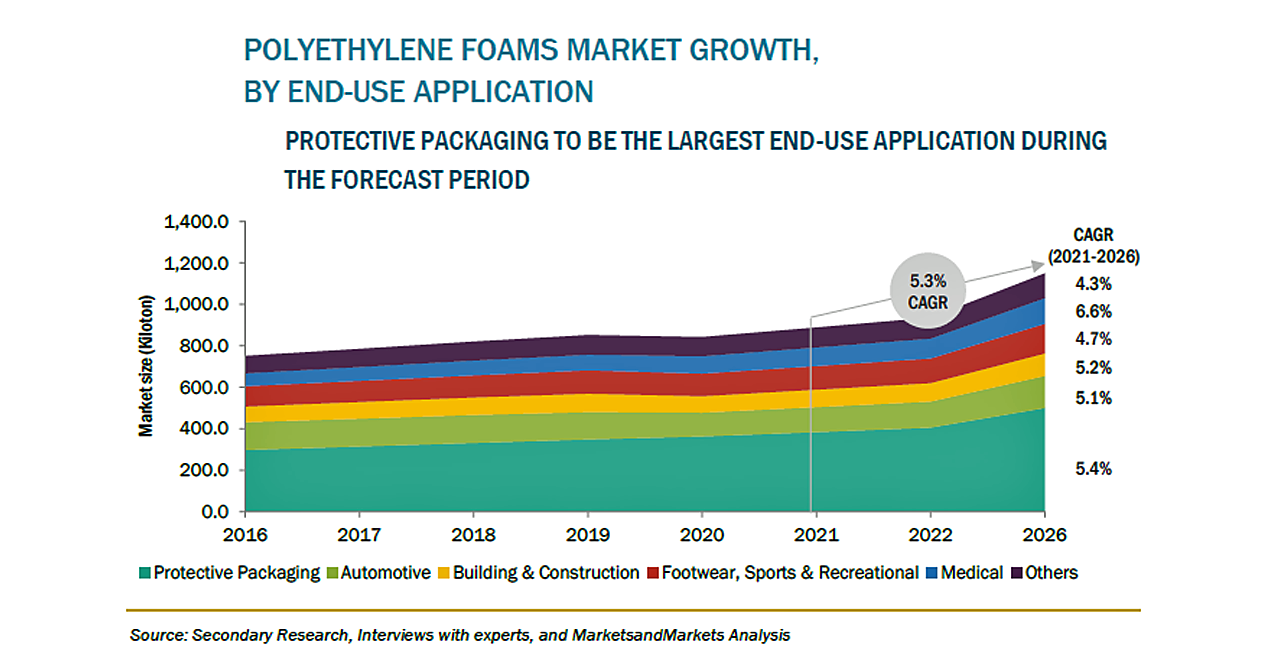 ポリエチレン(PE)フォームの市場規模は、2021年の36億米ドルからCAGR6.0%で成長し、2026年には48億米ドルに達すると予測されています。ポリエチレンフォームの需要は、APAC(アジア太平洋)地域を中心とした包装、自動車、医療などの産業の成長により急速に増加しています。
