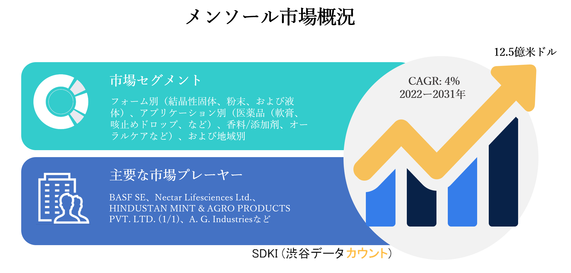 SDKI Inc.は、「メンソール市場ー世界の予測2022ー2031年」新レポートを 2022年03月17日に発刊しました。この調査には、メンソール市場の成長に必要な統計的および分析的アプローチが含まれています。レポートで提供される主要な産業の洞察は、市場の既存のシナリオに関する読者に市場の概要についてのより良いアイデアを提供します。さらに、レポートには、市場の成長に関連する現在および将来の市場動向に関する詳細な議論が含まれています。
