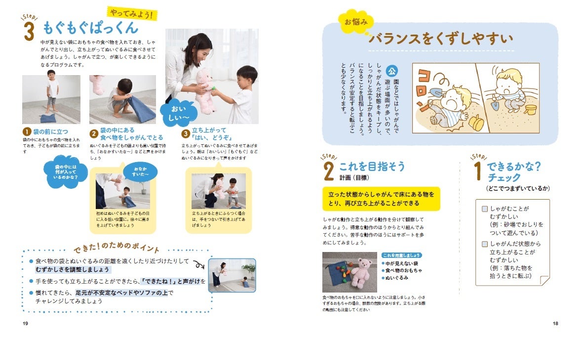 今までにつまずいていたことの確認、トレーニングでできるようにしたいこと、オリジナルのトレーニングプログラム、できるようになったかのチェックポイントや難易度の調整方法など。発達の専門家によって考案されたプログラムの実践方法を、わかりやすく紹介しているので家庭でも行うことができます。