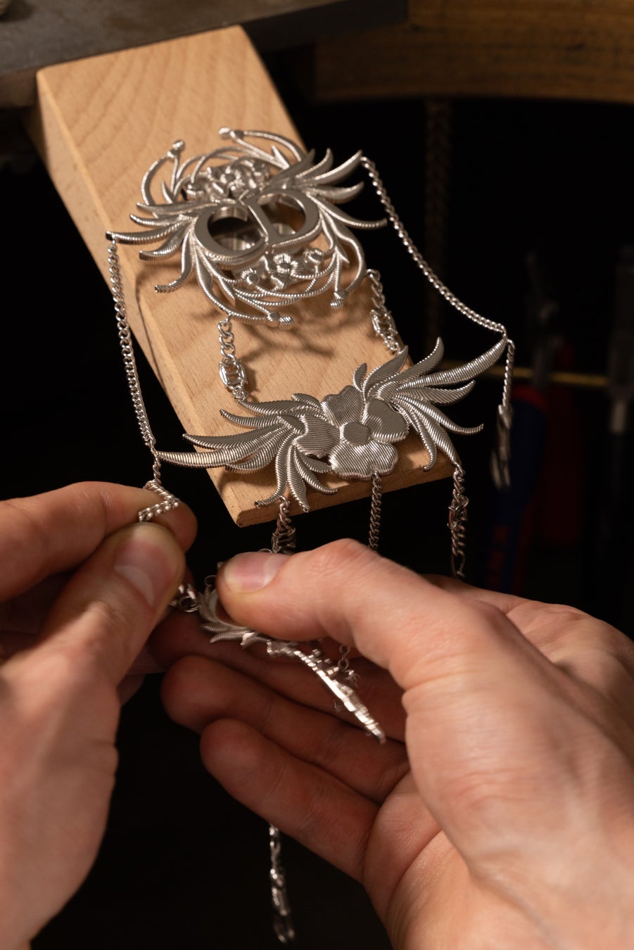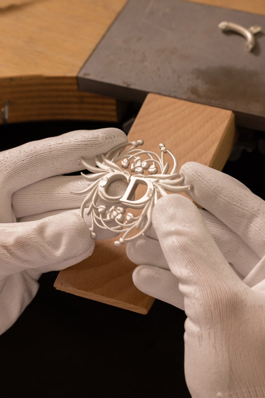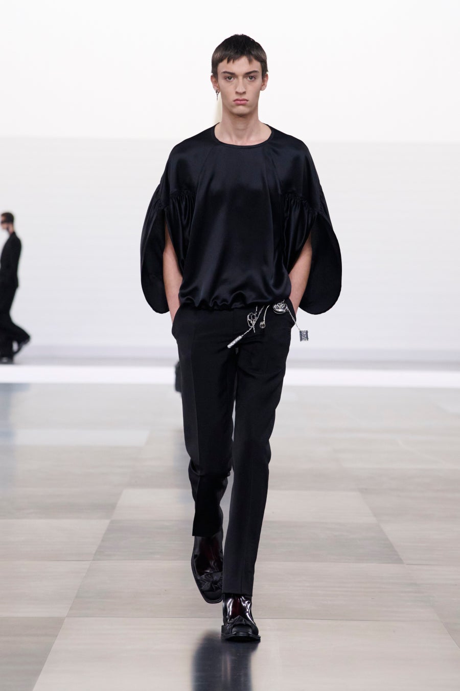 キム・ジョーンズによる2025-2026年ウィンター メンズ コレクションでパンツルックにアクセントを添えたアクセサリー「シャトレーヌ」。これは1954-1955年秋冬オートクチュール コレクションで協業していたジュエリー デザイナー、ミッシェル・メイヤーがヴィクトリア朝時代に影響を受け、歴史的に王族が鍵を入れるために使っていたピースからインスピレーションを得たものを再考しています。「シャトレーヌ」は、ボタンボックス、メジャー、シンブル(指ぬき)、針ケース、小さなハサミの5つで構成され、全てのピースは自由に動きます。このクリエイションはクチュールの芸術と、それを支える職人たちを讃えるものです。