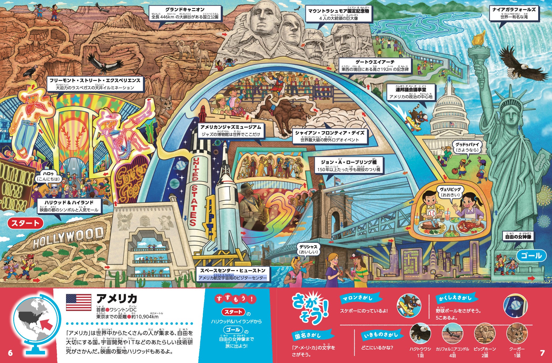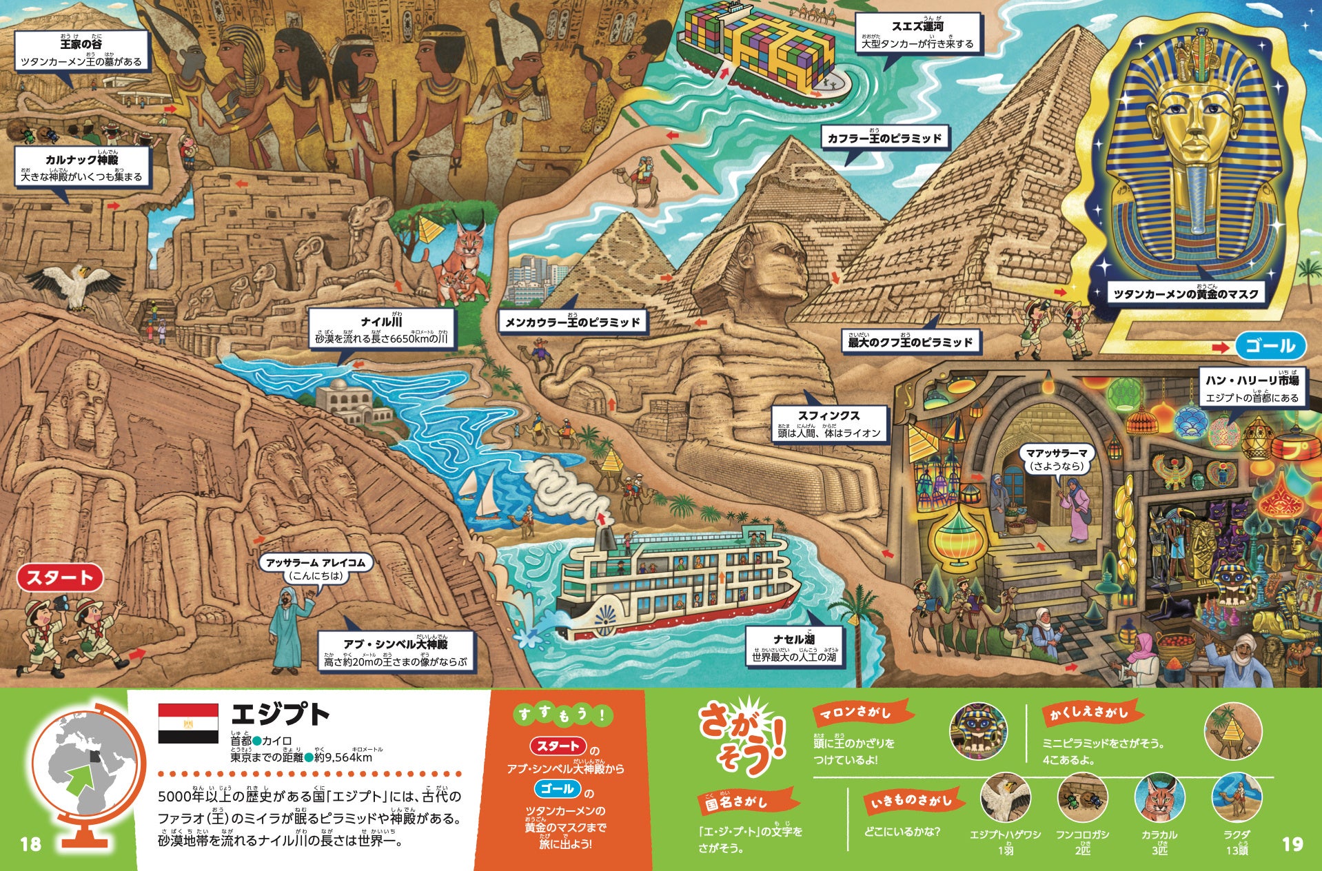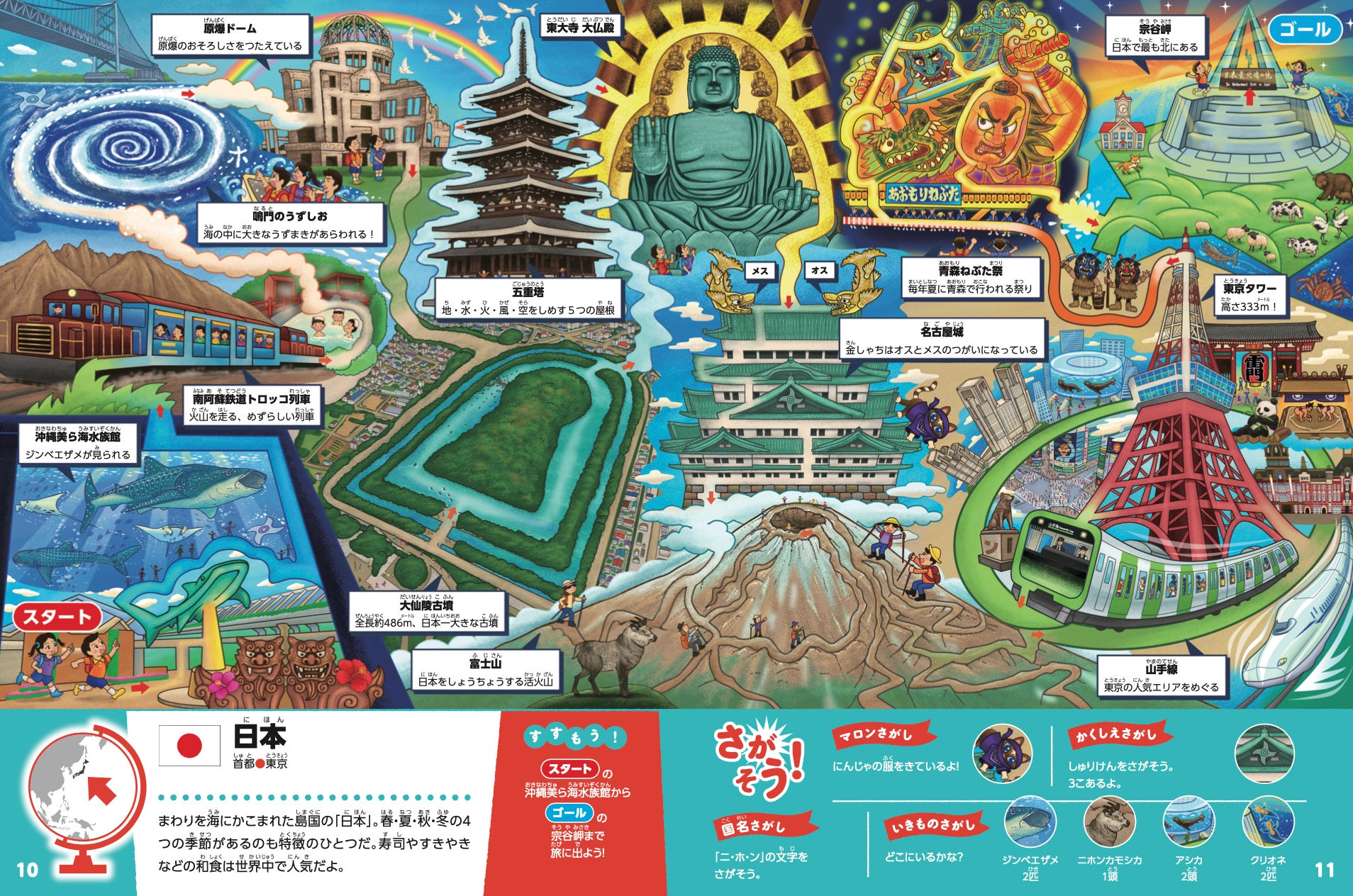 紹介している国は全部で12カ国。簡単な解説とともに名所を紹介しています。迷路の中には、国名の文字が隠されていたり、その国固有の生きものの絵が描かれていたりするので、迷路をしながら同時にさがし絵も楽しめます。