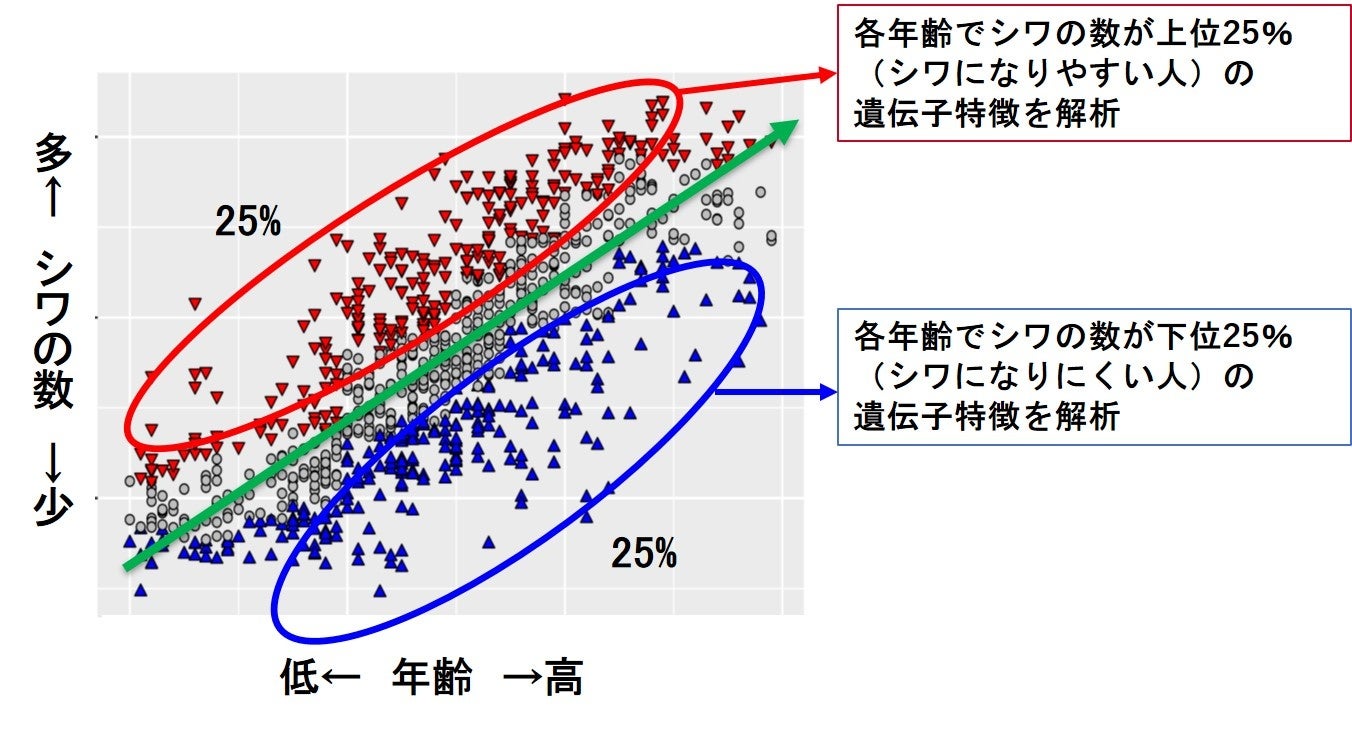 日本人女性1,472名のビッグデータを用いて、SNPと肌状態の関連性を調べました。当社の先行研究により、コラーゲン代謝関連因子など肌状態に直接的な影響を与える肌内部の因子に加え、血管の状態や、ビタミンなどの栄養成分代謝、ホルモン代謝など間接的に肌への関与が示唆されている体内因子から、79種類のSNPを厳選し、解析対象として設定しました(図2)。また、シワ、シミ、バリア機能などの豊富な項目の肌測定データに、紫外線履歴、喫煙歴、年齢などの情報も追加し、機械学習に用いました。そして、肌状態の各項目について年代別に比較を行い、平均から上下25%外れた人がもつ特徴的なSNPを解析し、独自の評価アルゴリズムを構築しました(図3)。