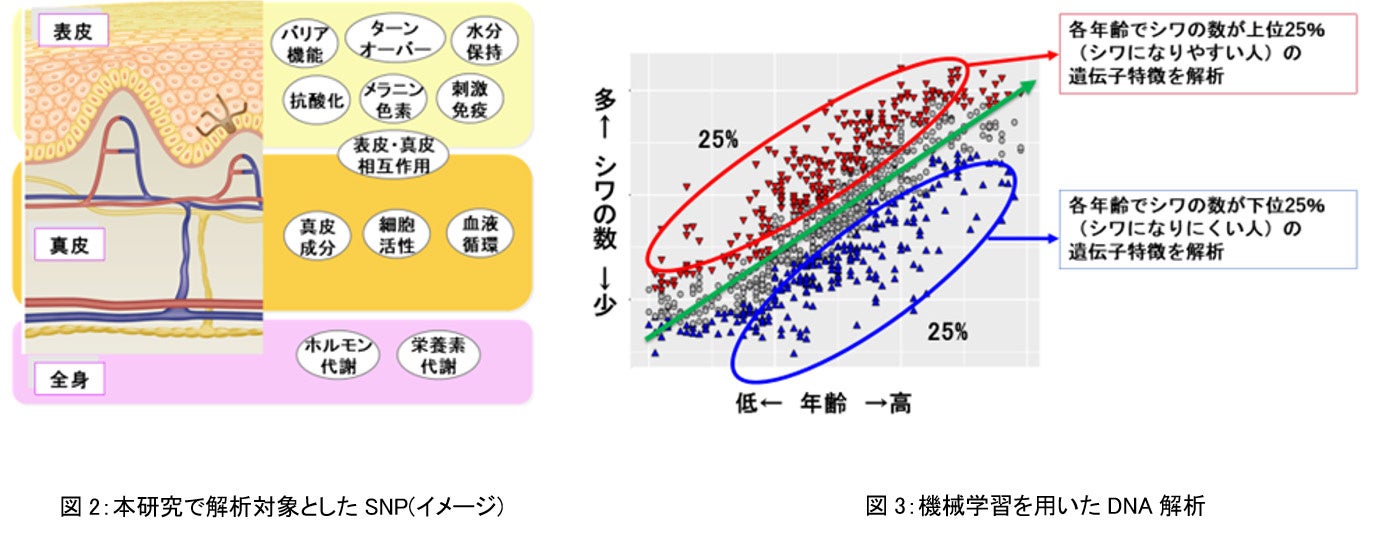 肌の状態は、紫外線対策などを含むスキンケアや、食事、運動、睡眠、喫煙などの生活習慣の影響に加えて、先天的な遺伝的特徴の影響も受けることがわかっています。遺伝的特徴には、DNAのSNPの違いが影響しており、個人毎にさまざまなSNPを持つことが知られています。現在の肌状態に加えて、こうしたSNP情報をもとにした生まれもった肌の特徴を理解することができれば、高いパーソナライズ性のある、これまでにないビューティーケアの提案に繋がると考えました。お客さまのなりたい肌の実現に向け、長年にわたる皮膚科学研究とAIなどの新たな技術を組み合わせ、SNPと肌状態の関連性について研究を進めました。