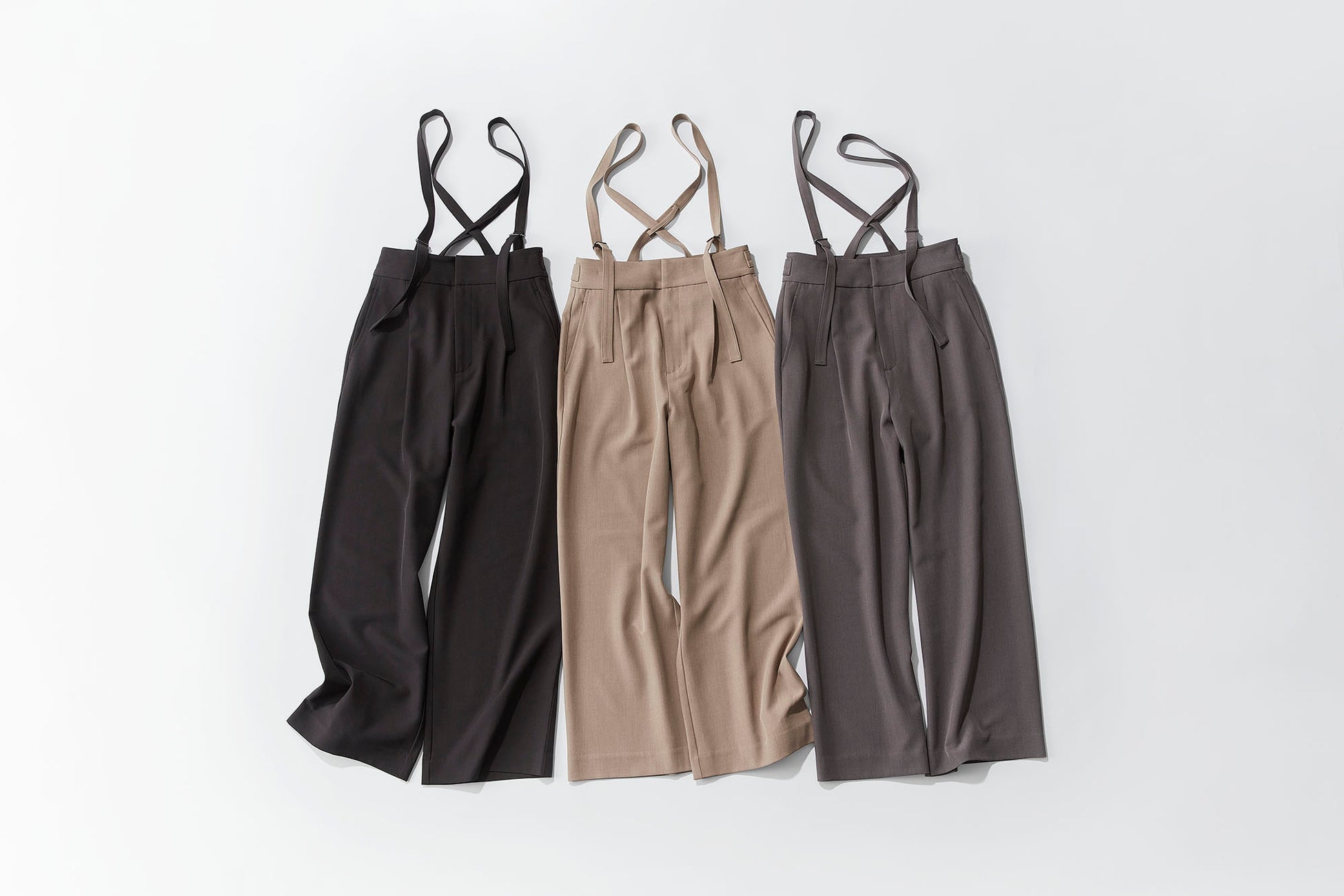 サスペンダーを付けても外してもはける万能なワイドパンツ。計算しつくされたサイジングでスタイルアップ効果も狙えます。