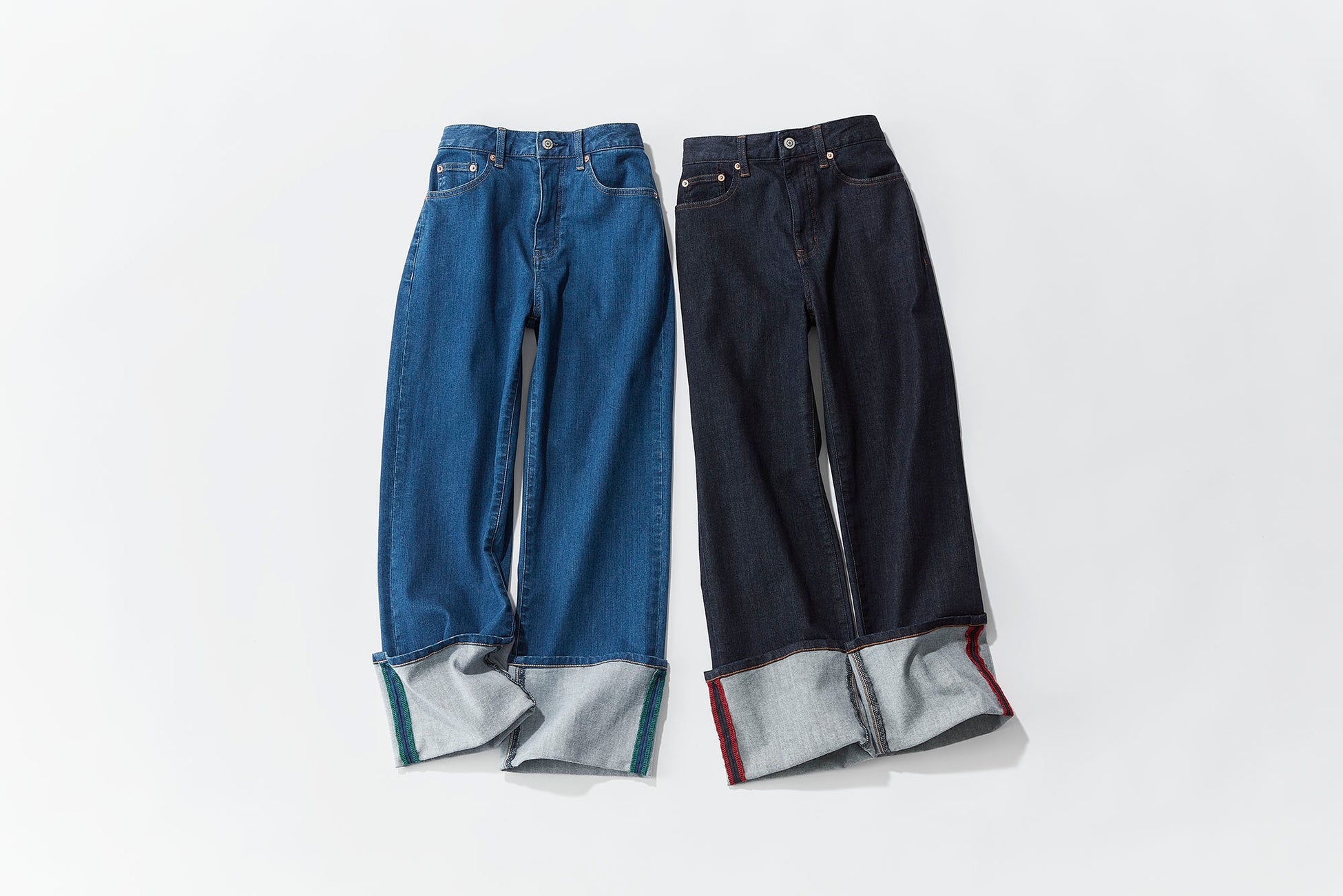裾の折り返しデザインが特徴のデニムパンツ。デザイン性だけでなくストレッチの効いた素材で動きやすさも抜群です。