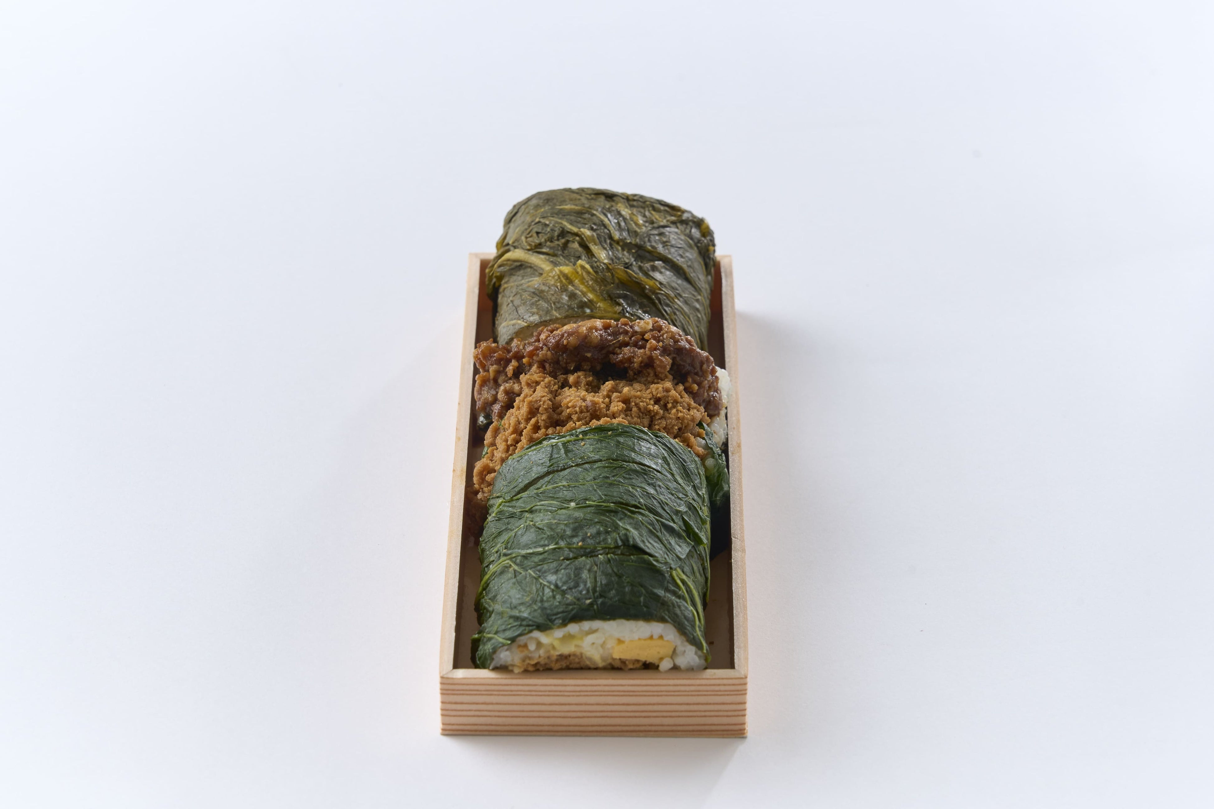 しっかりした味わいのやわらか牛肉煮と旨味たっぷりの鶏そぼろを海苔と高菜の二重巻きに。高菜は新高菜漬けと古高菜漬けの2種類を楽しめます。