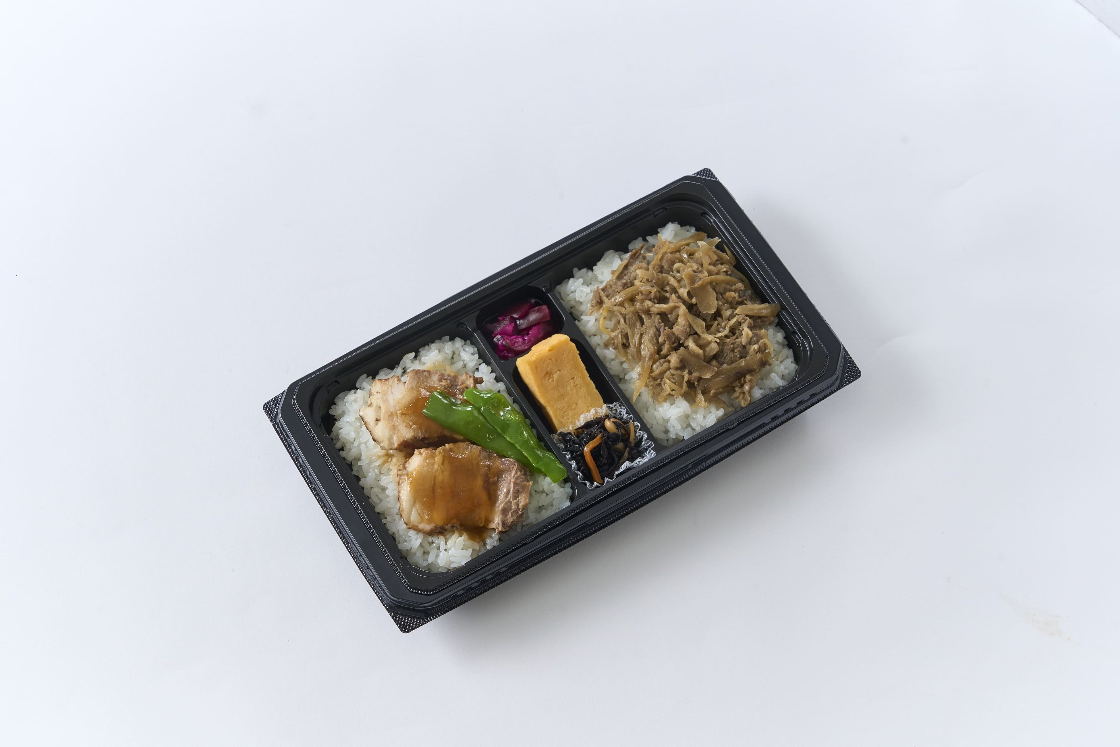 定番人気商品の豚角煮を弁当にしました。鶏もも肉はゆずこしょう風味にして、Wでお肉をお楽しみいただけるお弁当です。