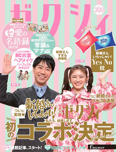 今年創刊30周年を迎えた『ゼクシィ』と放送開始から52年を数える長寿番組『新婚さんいらっしゃい!』のタッグが誕生し、今後さまざまな企画を展開していくことが決定しました。これを記念して作成されたコラボ内限定の「ゼクシィ記念表紙」には、番組MCの藤井 隆さん、井上 咲楽さんが登場。おふたりの笑顔あふれる、幸せいっぱいの一枚になりました。