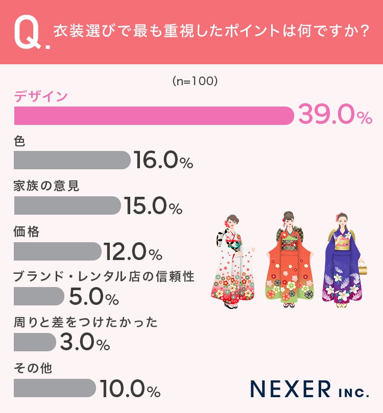 振袖選びで最も重視されたのは「デザイン」で39%と圧倒的多数を占め、個性を表現し、納得のいく一着を選ぶことが最優先されているようです。