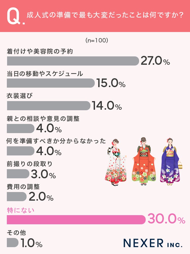 準備で最も大変だったことは「着付けや美容院の予約」が27%でした。