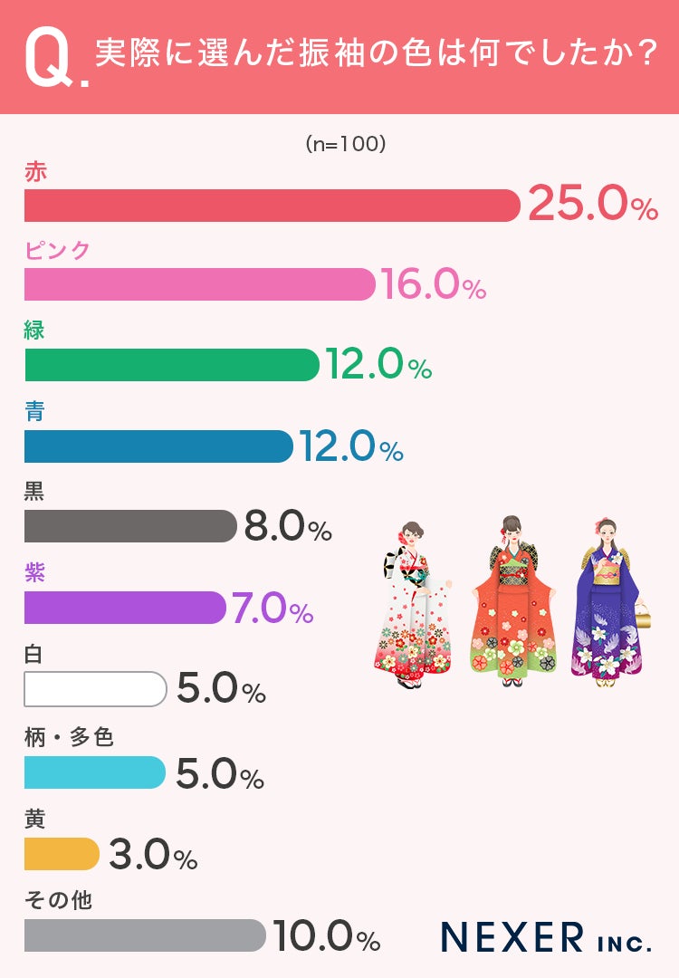 実際に選ばれた振袖の色は、古典的で華やかな「赤」が25%で最も人気でした。