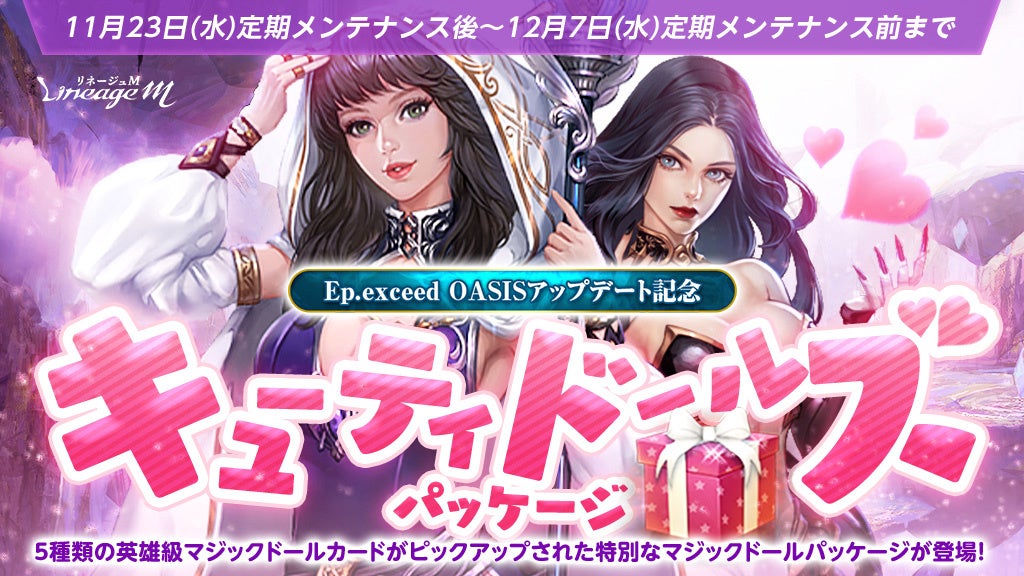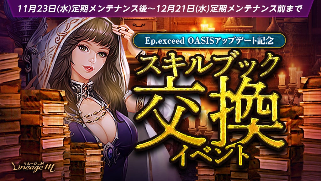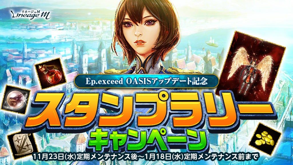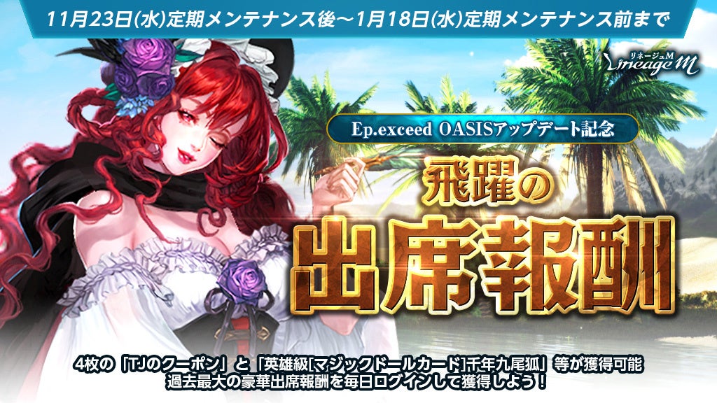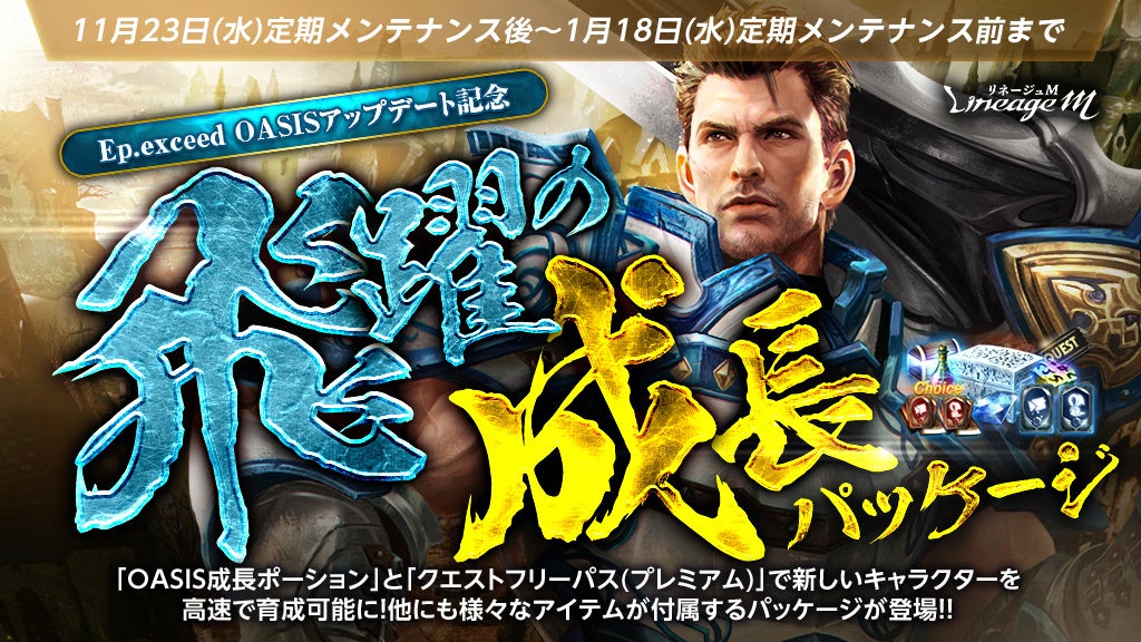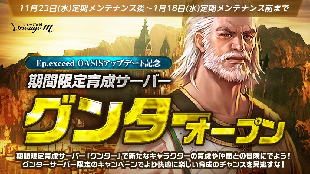 PCオンラインRPG「リネージュ」のモバイル版タイトル『Lineage M(以下、リネージュM)』のサービス、運営をしているエヌ・シー・ジャパン株式会社(東京都港区、代表取締役:金 澤憲(キム テクホン) 以下、エヌシージャパン)は、2022年11月23日(水/祝)に、最新大型アップデート「Ep.exceed OASIS」として、「全職業対象クラスケア」の実施、「TJのクーポン」の登場、期間限定育成サーバー「グンター」の登場をはじめ様々なイベントおよびキャンペーンを開始しました。