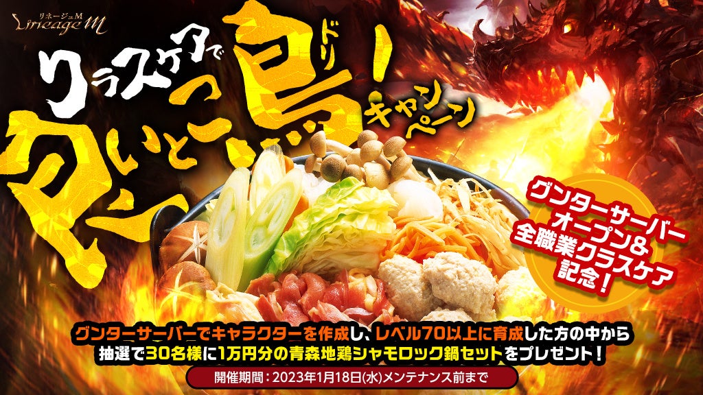 キャンペーン期間中に、「グンター」サーバーで作成したキャラクターをレベル70以上に育成した方の中から抽選で30名様に「青森地鶏シャモロック鍋セット 1万円分」をプレゼントします。