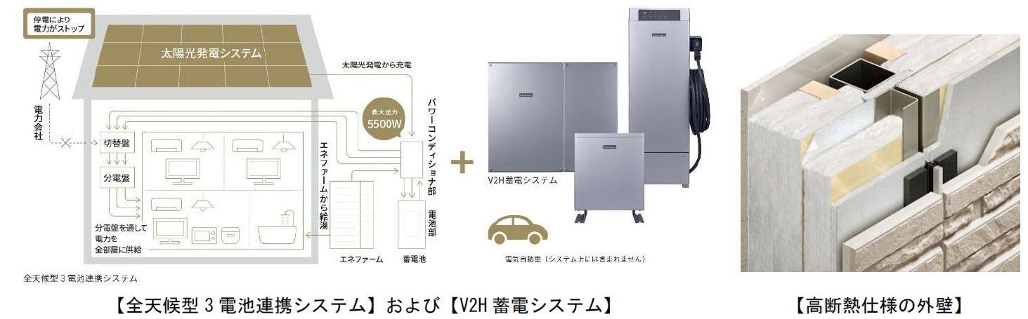 あわせて、当社で発売する戸建住宅商品としては初めてV2H(※3)と全天候型3電池連携システムを連携させたことで、太陽光発電システムで発電した電気のうち、余剰電力を蓄電池と電気自動車に同時に充電。蓄えられた電気は、住宅内で使用できるほか、電気自動車にも活用できるため、クリーンな電気を最大限に有効活用し、電気代の削減にも貢献します。加えて、大容量の電力を蓄えられる電気自動車から住宅内に給電もできるため、停電時などの非常時の電源確保もこれまでより約3日間(※4)長く継続できます。