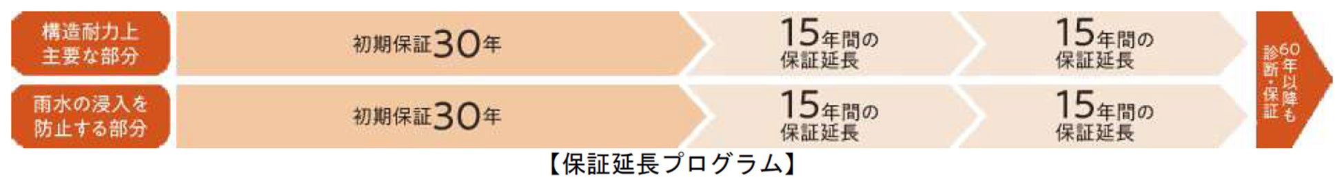 両商品では、定期点検に加え、診断と保証延長を組み合わせたアフタープログラムを用意。構造躯体・防水の初期保証30年を実現するとともに、点検プログラムによって、60年までの長期保証(※11)を実現します。60年以降もお客さまのご要望に応じ、長期に亘り点検(有償)が可能です。