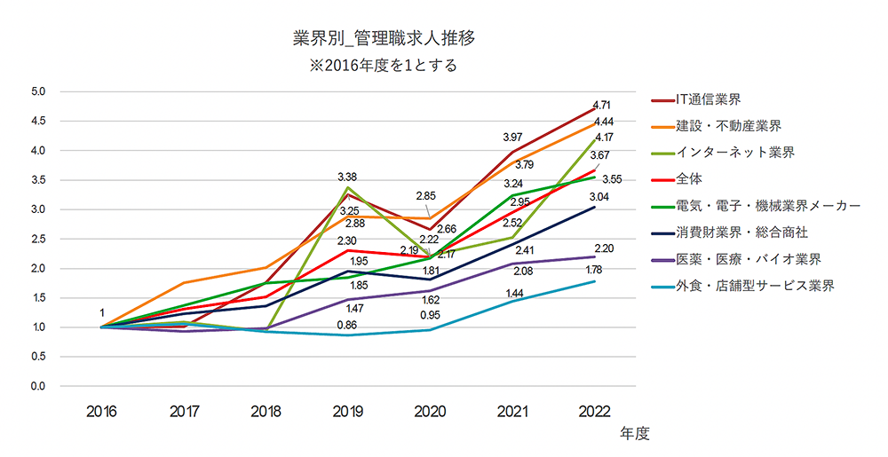 業界別に、管理職求人の推移を見てみると、2016年度を1としたときに2022年度で最も伸びているのはIT通信業界だった。次いで建設・不動産業界になっているが、どちらも苛烈な人手不足と言われている業界だ。また、IT通信業界では、デジタル化が進む中で需要が高まっており、組織の拡大が急務になっている企業も多い。