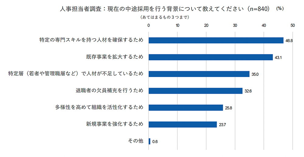 ※参考:人事担当者調査では、中途採用の背景を聞いたところ、「特定層(若者や管理職層など)で人材が不足しているため」と答えた割合は35.0%に上っている。