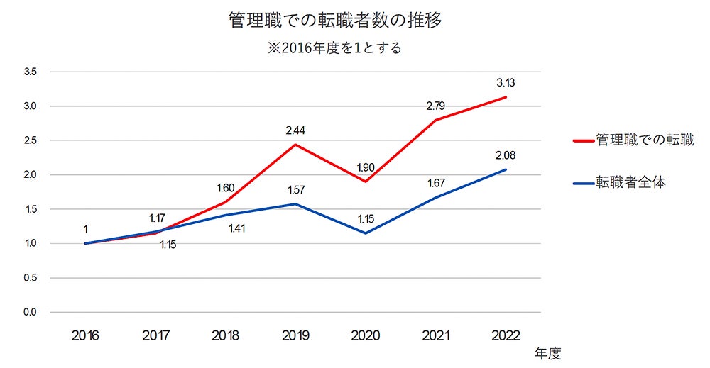 かつて日本企業においては、年功序列、終身雇用を前提とした日本型雇用慣行や、企業内特殊的熟練(※)が中心に身に付くキャリア環境であり、他社への管理職の転職は一般的ではなく難しいというイメージがあった。また、実際、エグゼクティブ層やごく限られた一部の方が転職しているという状況だった。しかし、ここ数年で社会の変化や人手不足を背景に、日本企業も変化を迫られている。注力事業に外部人材を起用するだけでなく、新しい事業領域への転換のために、自社にないノウハウを持った外部人材を管理職登用する動きも出ている。結果として、2016年度を1としたときの管理職の求人は2022年度では3.67倍になっており、コロナ禍で新規の求人が落ち込んだ中でも、管理職求人は減少しなかった。