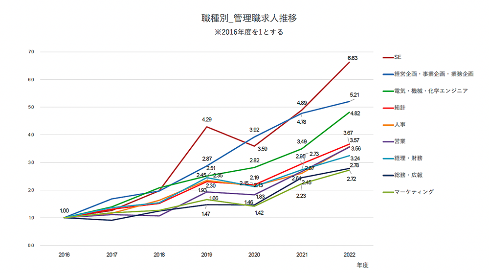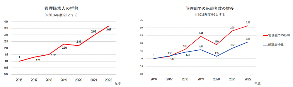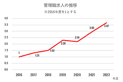 1.管理職求人は増加傾向(2022年度は、2016年度の3.67倍)。