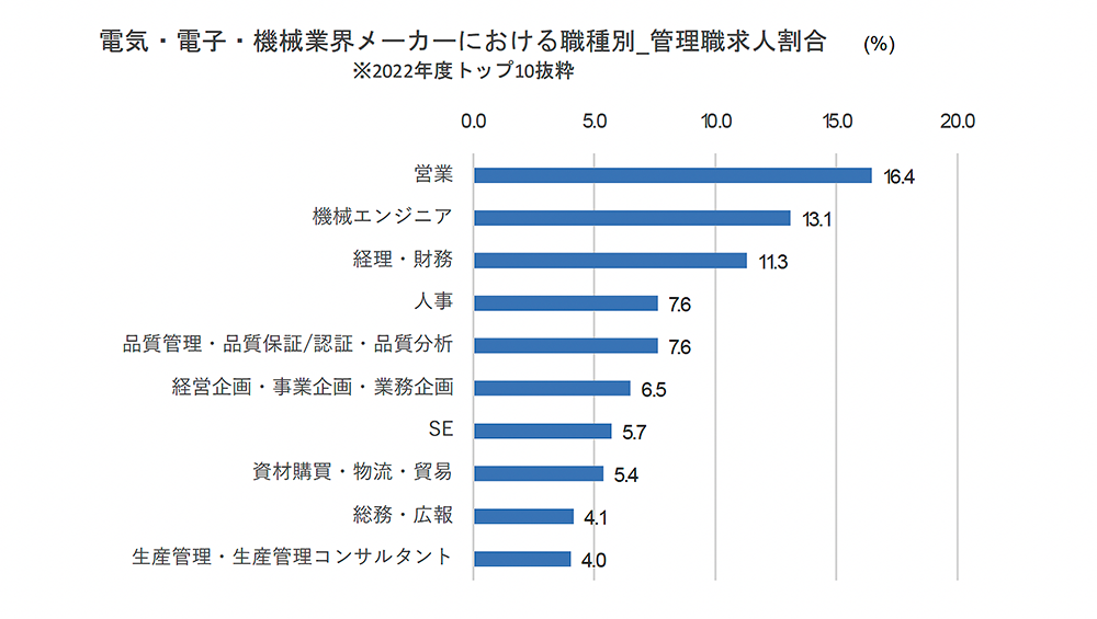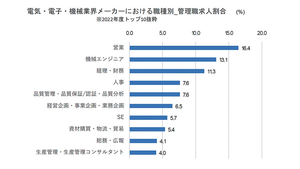 下図は、2022年度の電気・電子・機械業界メーカーの管理職求人の割合を職種別(上位10職種)に見たものだ。事業拡大・変革のための営業や、製造部門に直結する機械エンジニア(生産技術含む)・生産管理、変化対応のための人事やマーケティングなど管理部門まで幅広く募集していることがわかる。