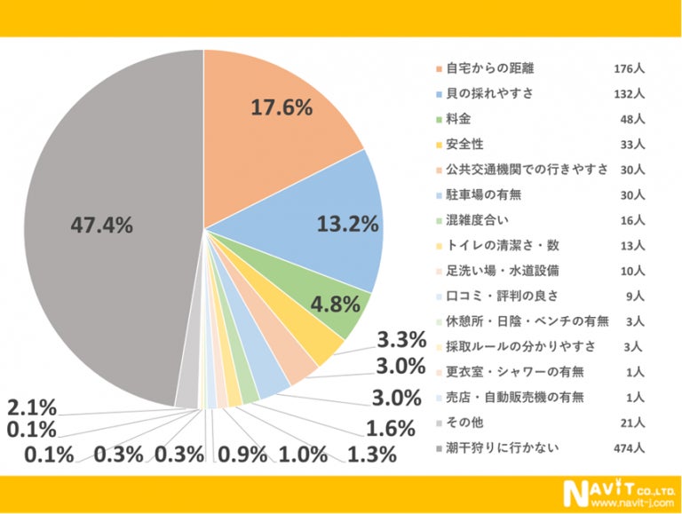 潮干狩りをする場所を選ぶ際に、最も重視する点についてのアンケート結果です。最も多かった回答は「自宅からの距離」で17.6%、次に多かったのは「貝の取れやすさ」で13.2%、3番目に多かった回答は「料金」で4.8%という結果になりました。潮干狩りに行くと潮風でベタベタするので、早く家に帰ってシャワーを浴びたりできた方がいい、ということでしょうか。