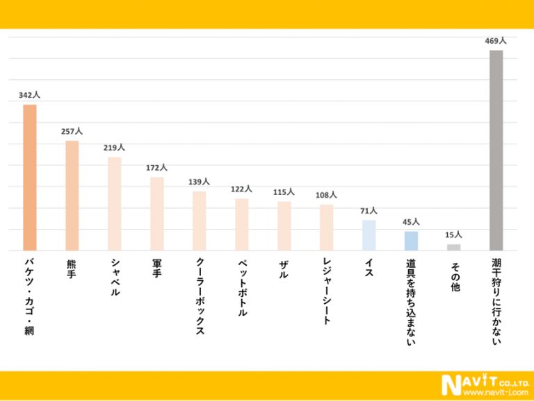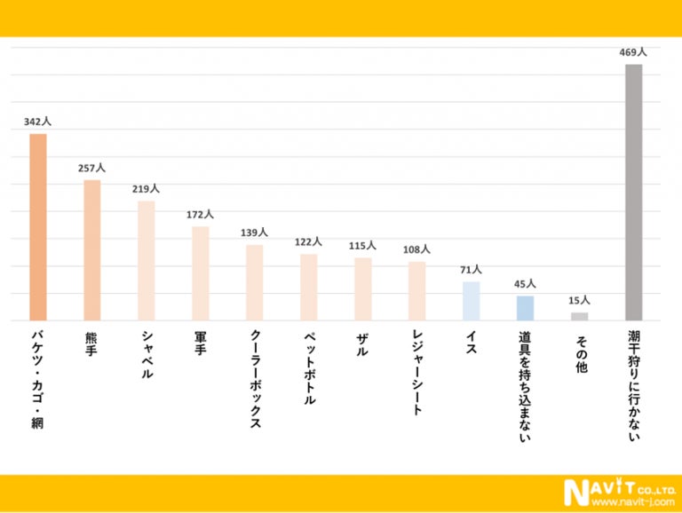 潮干狩りの際に自宅から持ち込む道具は何ですか?というアンケートを複数回答にて回答いただきました。「バケツ・カゴ・網」が342人、「熊手」と回答された人が257人、「シャベル」と回答された人が219人という結果になりました。潮干狩りに行くには、この3つは必須ということでしょう。