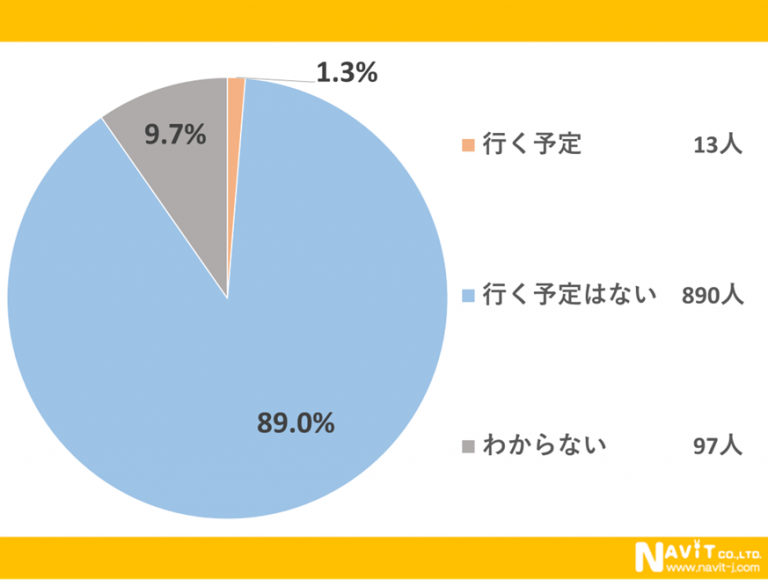 2026年に潮干狩りに行く予定はあるかについてのアンケートでは、「行く予定」と回答された人は1.3%で「行く予定がない」と回答された人は89.0%という結果になりました。
