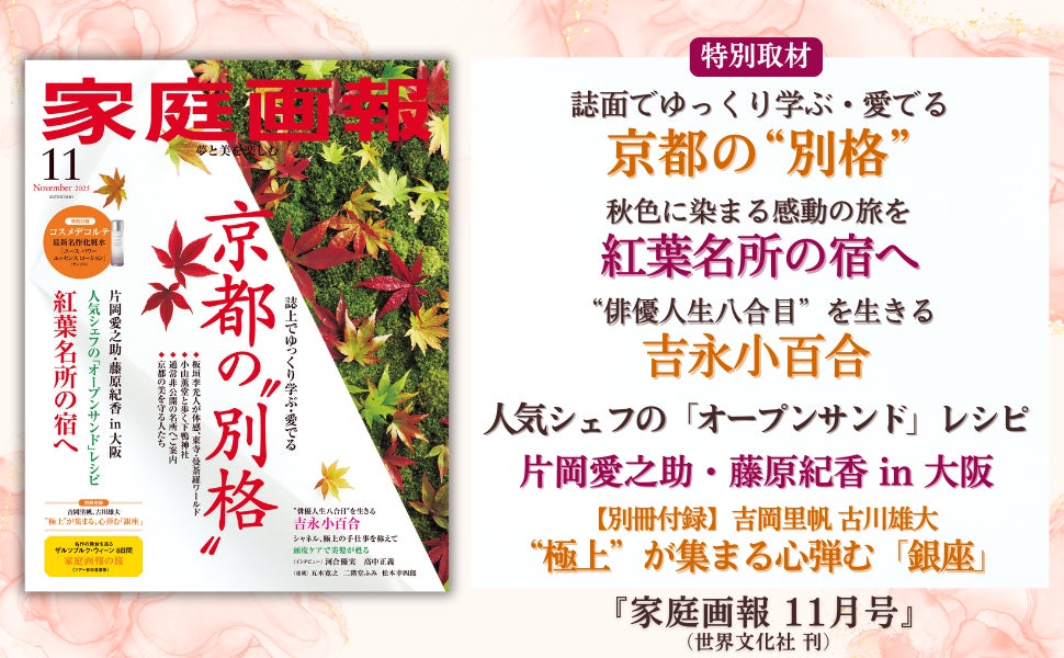 株式会社世界文化社は、『家庭画報 11月号』を10月1日(水)に発売します。巻頭特集「京都の”別格”」では、小山薫堂さんや板垣李光人さんと寺社を巡り、深淵なる京都を学びます。「紅葉名所の宿へ」では、秋色を満喫する極上宿を厳選してご案内。さらに、人気シェフの「オープンサンド」レシピ、片岡愛之助さんと藤原紀香さんが訪れる「大阪・関西万博」、銀座の今を巡る別冊付録には吉岡里帆さんと古川雄大さんが登場。五感を刺激する秋を、誌面から堪能してください。