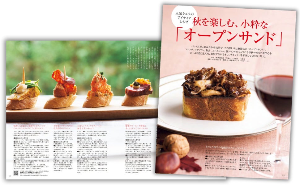パン×具材の組み合わせ次第で、楽しみが無限大の「オープンサンド」。フレンチ、イタリアン、和食、スパニッシュのシェフたちが、秋の味覚と遊び心をたっぷり盛り込んだ、家庭で作れるオリジナルレシピを考案してくださいました。そして、パンの探究者・池田浩明さんがおすすめする、極上のオープンサンドを味わえる東西の7軒も必見です。