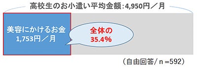 1カ月に美容にかける金額を聞くと、平均金額は「1,753円」という結果に。これは、以前調査したお小遣いの平均月額「4,950円」(※)の35.4%を占めており、高校生にとって非常に関心が高く、お金を使いたいところ、といえそうです。