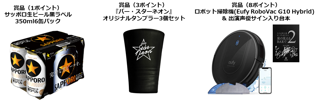 コンビニエンスストア限定で販売されるサッポロ生ビール黒ラベルのキャンペーンデザイン缶を購入し、専用応募シールの二次元コードから特設サイトにアクセス、 CLUB黒ラベルに会員登録いただくことで参加可能となります。サイト内でオリジナルオーディオドラマを視聴するごとにもらえるポイントを使いキャンペーン賞品に応募でき、抽選で「サッポロ生ビール黒ラベル350ml6缶パック」を1,000名様、「『バー・スターネオン』オリジナルタンブラー3個セット」を300名様、「ロボット掃除機(Eufy RoboVac G10 Hybrid) & 出演声優サイン入り台本」を10名様にプレゼント。