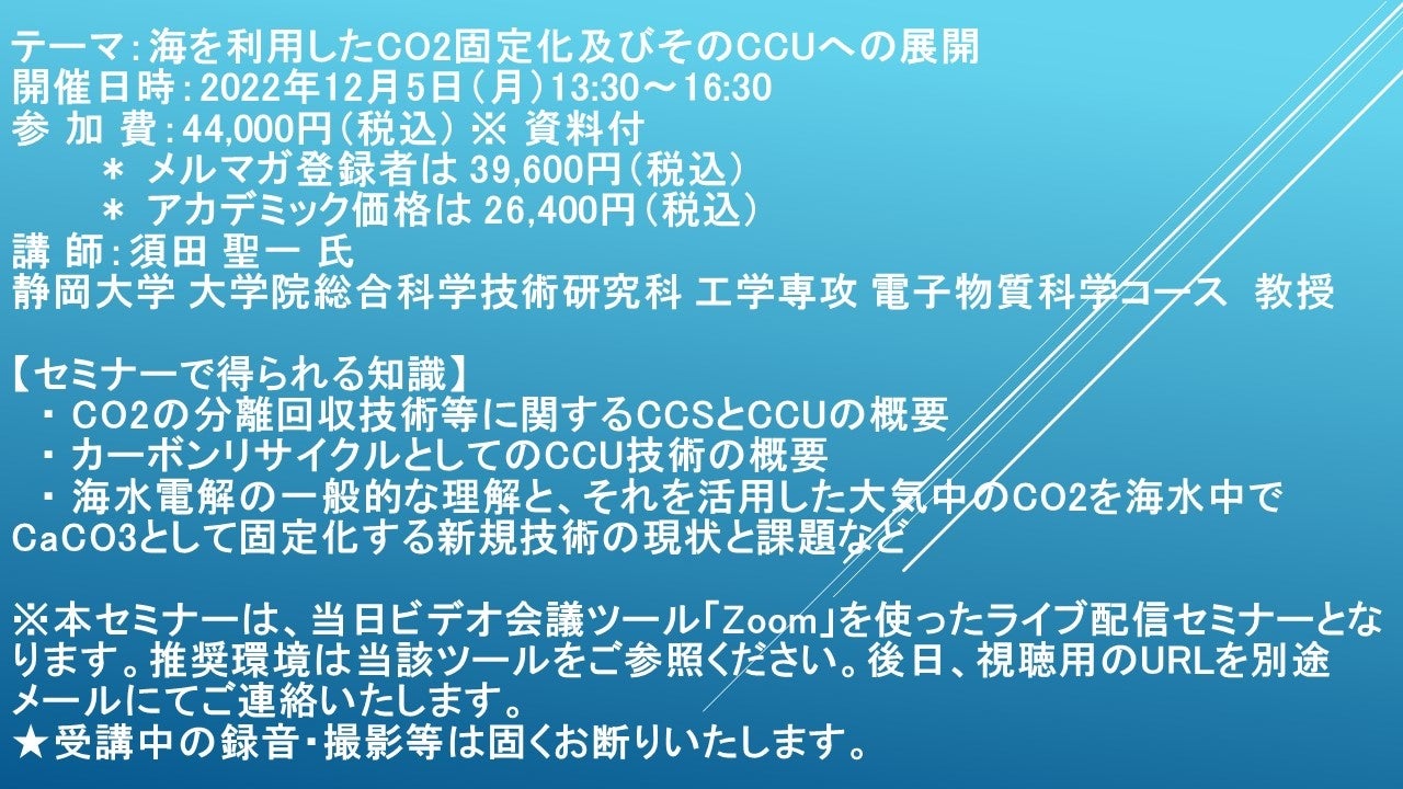 先端技術情報や市場情報を提供している(株)シーエムシー・リサーチ(千代田区神田錦町: https://cmcre.com/ )では、 各種材料・化学品などの市場動向・技術動向のセミナーや書籍発行を行っておりますが、 このたび「海を利用したCO2固定化及びそのCCUへの展開」と題するセミナーを、 講師に須田 聖一 氏 静岡大学 大学院総合科学技術研究科 工学専攻 電子物質科学コース 教授)をお迎えし、2022年12月5日(月)13:30より、 ZOOMを利用したライブ配信で開催いたします。 受講料は、 一般:44,000円(税込)、 弊社メルマガ会員:39,600円(税込)、 アカデミック価格は26,400円(税込)となっております(資料付)。