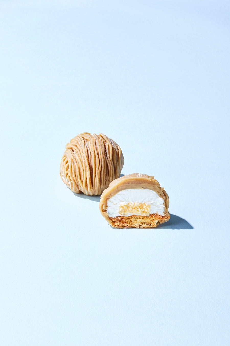 大正15年に誕生したゴルフボール形の最中。ゴルフが限られた階層だけのスポーツだった当時、斬新な和菓子として好評だったそう。中には、濃厚な味わいのこしあんがぎっしり詰まっています。