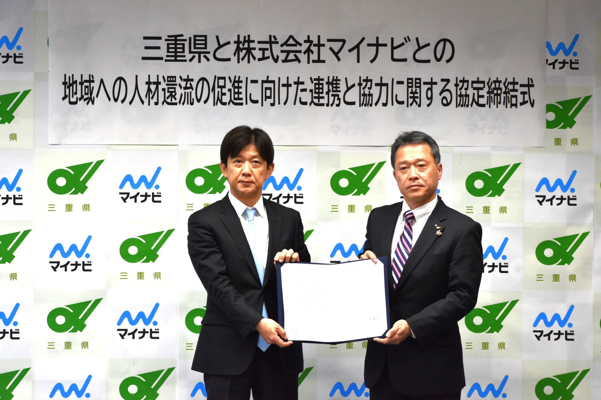 株式会社マイナビ(本社:東京都千代田区、代表取締役 社長執行役員:土屋芳明)は、三重県(知事:一見勝之)と「地域への人材還流の促進に関する連携協定」を締結しました。当社が自治体と高校生を対象にした人材還流に関する協定を締結するのは初めてです。それに伴い、4月9日に三重県庁(三重県津市)にて協定締結式を行いました。
