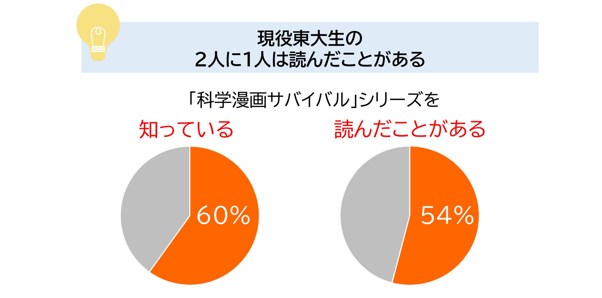 さらに、「東大家庭教師友の会」を運営するトモノカイが実施した調査(※2)では、現役東大生の2人に1人が「科学漫画サバイバル」シリーズを「読んだことがある」と回答したほか、理系の学生の約半数が「自分が理系に進むきっかけになった」と回答。競合作品(※3)との比較でも、「一番よく読んだ学習漫画」としてトップを獲得し、「ストーリーが面白くキャラに感情移入できるため、自分の実体験のように科学知識がつく」「漫画を読むだけで知的好奇心が刺激された」「様々な環境でのライフハックが学べて楽しかった」などと評価されています。
