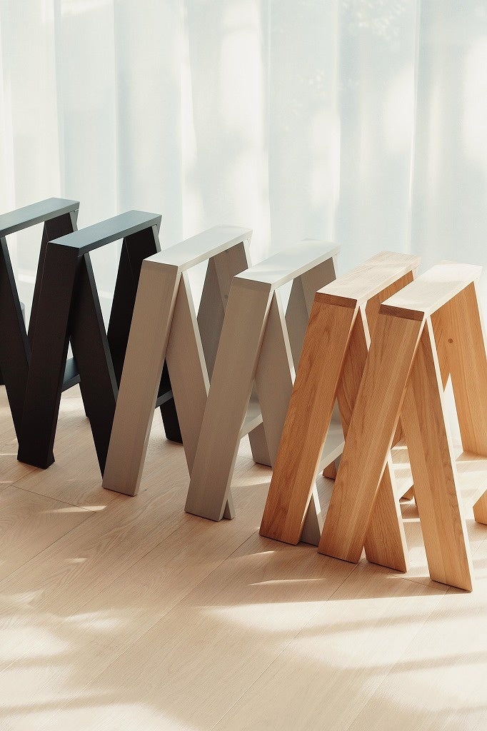 横から見ると「A」に見えるユニークなアイテム。単体でスツールとして、複数台を横に重ねて荷物置きのカウンターにしたりと、使い方は自在です。家具用材として不適格な木材を有効活用し、森林保全や林業の活性化といった、自然との共生の実現につながることを目的に活動しています。