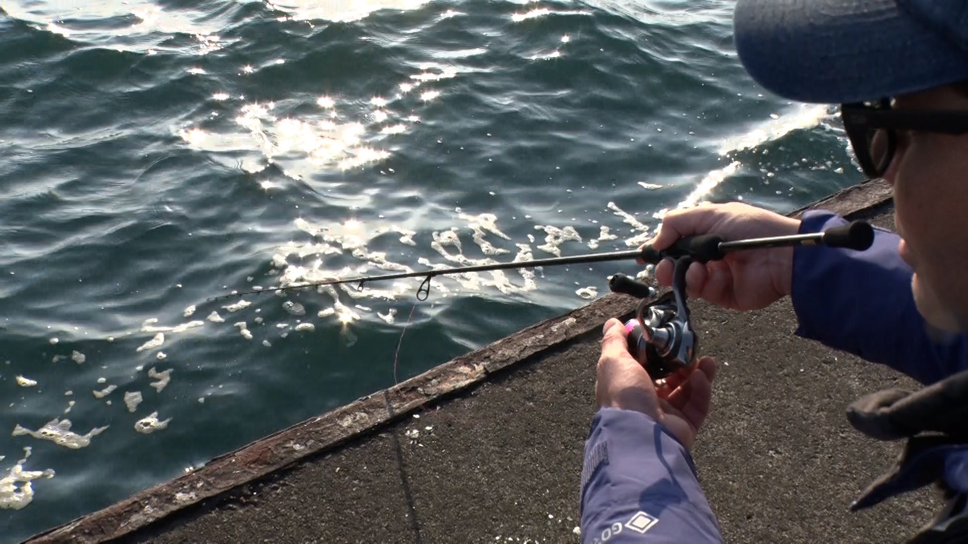だが渡邉のアドバイスをもとに徐々に感覚を掴んでいく照英。すると手元に違和感が…。半信半疑でアワセを入れる。すると…竿先が大きくしなる。アジングでの初ヒット!それになかなかの重量感を感じる引きだ。