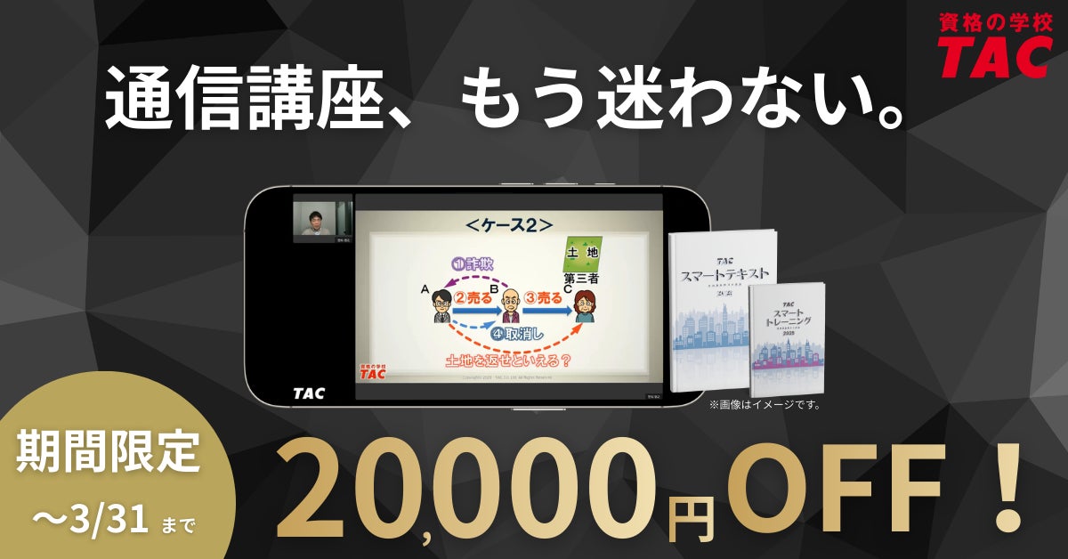 【TAC宅建士講座】3/31まで!20,000円OFF!宅建通信講座ならTACで決まり!
