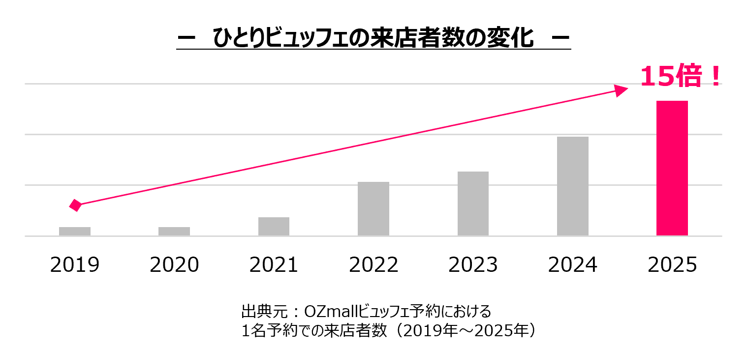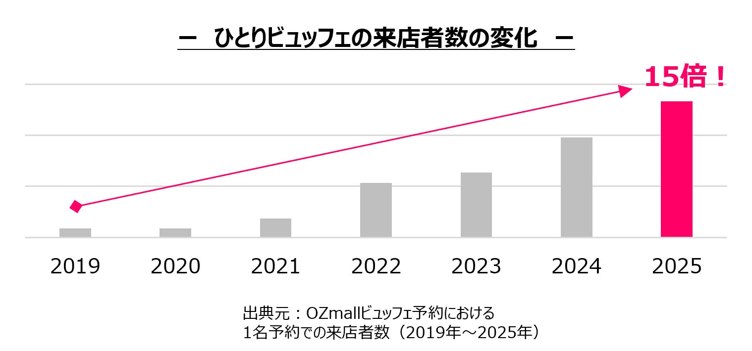 スターツ出版株式会社(本社:東京都中央区、代表取締役社長:関根赴治)が運営する「OZmall(オズモール)」(会員数500万人)では、近年増加している“ひとりビュッフェ”の利用動向を、予約データおよびユーザーアンケートから分析しました。 OZmallにおける「ひとりビュッフェ」の予約数は、2019年以降約6年間で約15倍に増加。「ビュッフェは複数人で行くもの」という従来の常識が、少しずつ変わり始めています。 OZmallでは、こうしたニーズの高まりに合わせて、来年3月まで毎月「おひとりさま貸し切りビュッフェ」イベントを開催します。