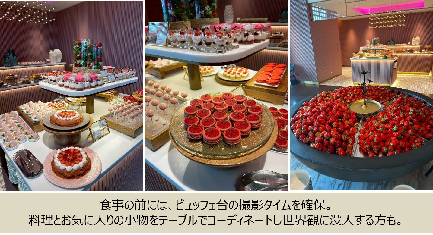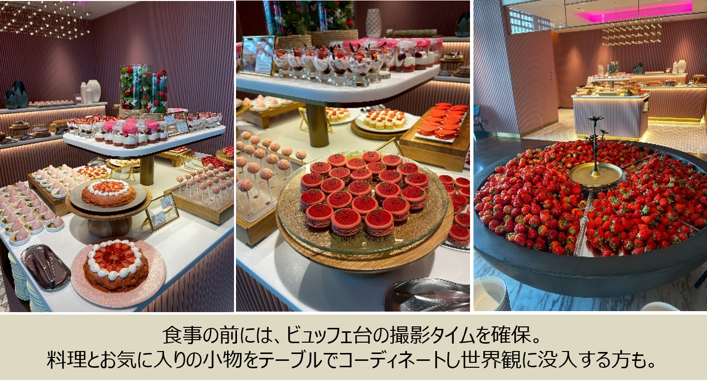 4月にウェスティンホテル横浜で開催された「おひとりさま貸し切りいちごビュッフェ」イベントは、22名分の予約枠が即完売!本イベントでは、おひとりさま専用のエリアをご用意し、食事開始前にはビュッフェ台の撮影時間を確保するなど、周囲を気にせず自分のペースで食事や撮影を楽しめる環境を整えました。