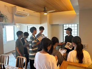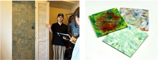 また、希望した生徒が、実際に海洋プラスチック廃棄物をアップサイクルした建材が使われているリノベーションマンションを見学しました。同じく海洋プラスチック廃棄物の活用に取り組む福井市の工房、株式会社ソリッドラボが運営するものづくり工房「TONKAN terrace」が手掛けたタイルが、室内の目を引く場所に内装されている様子を見学していただきました。