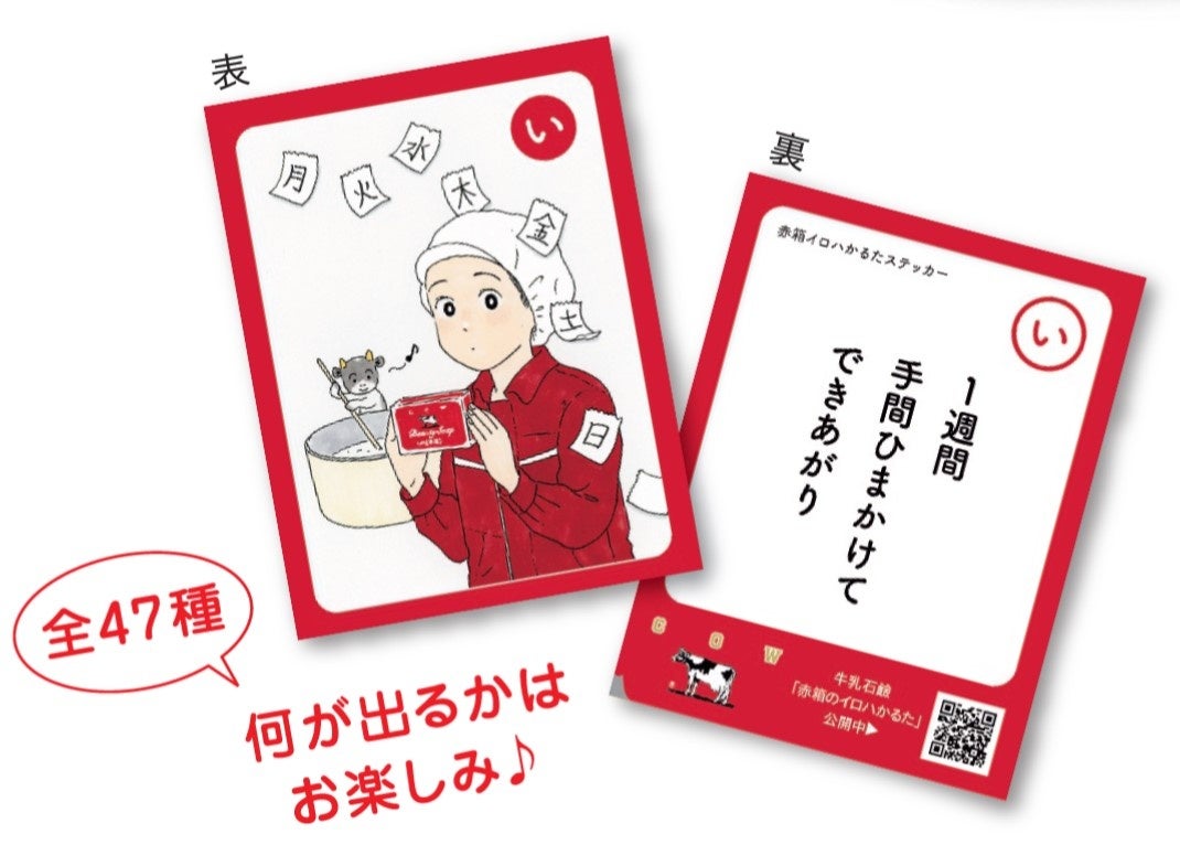 赤箱の特徴がわかる全47種。表面はイラストレーターあわいさんによる絵札デザイン、裏面は読み札デザインステッカー。