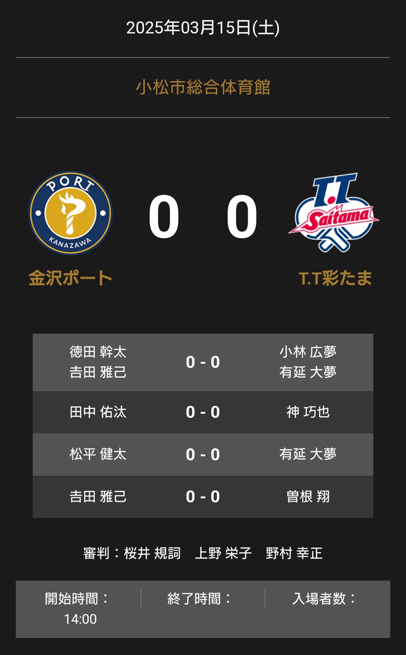ノジマTリーグ 2024-2025 公式戦 3月15日開催 金沢ポート vs T.T彩たま オーダー発表
