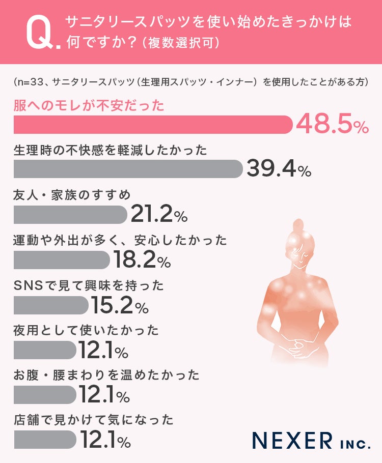 48.5%が「服へのモレが不安だった」、39.4%が「生理時の不快感を軽減したかった」、21.2%が「友人・家族のすすめ」と回答しました。