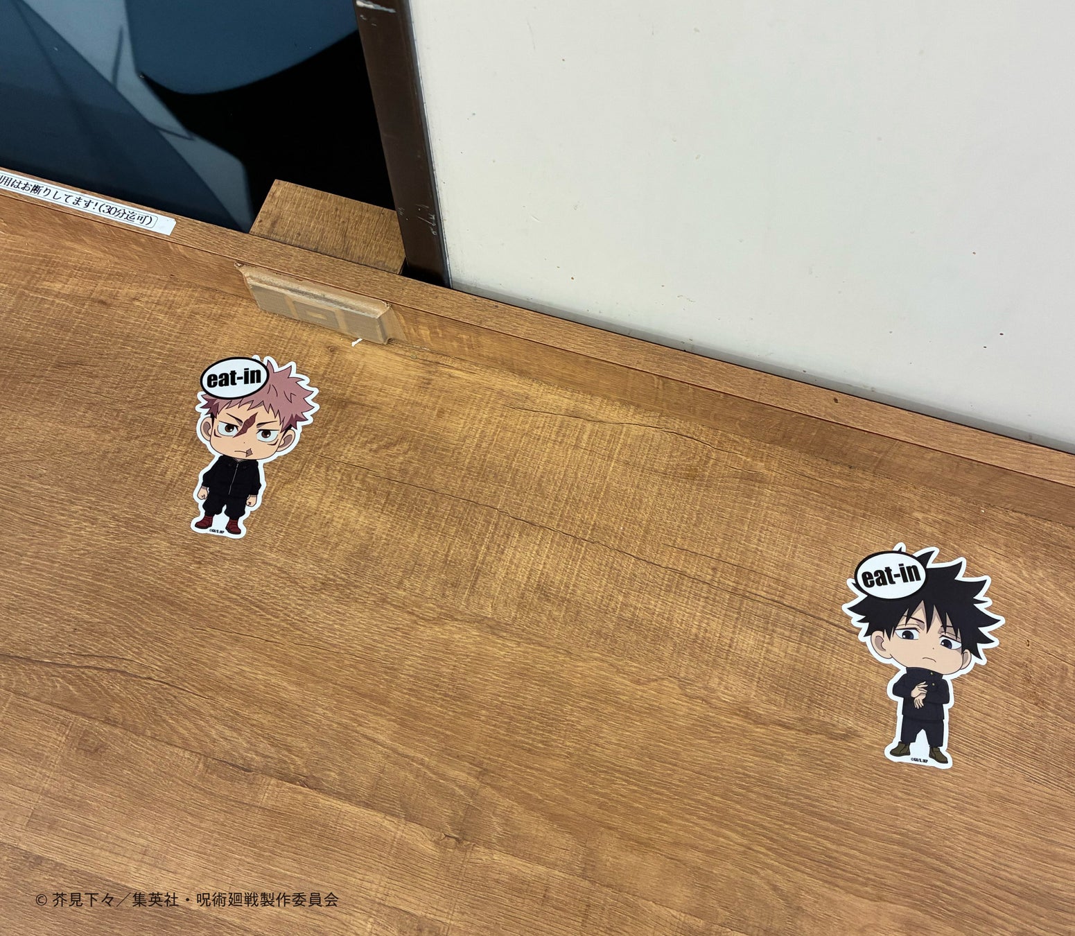 「ファミマ回游スタンプラリー」 の賞品「オリジナルポストカード」を受け取る際に「完了印」を店舗スタッフが押印いたします。各店舗で違うデザインが用意されており、東池袋セイコービル店では虎杖悠仁、銀座木挽町通り店では 乙骨憂太の「完了印」を押印してもらえます。また、渋谷公園通り店では獄門疆の「完了印」で“封”印してもらえます。
