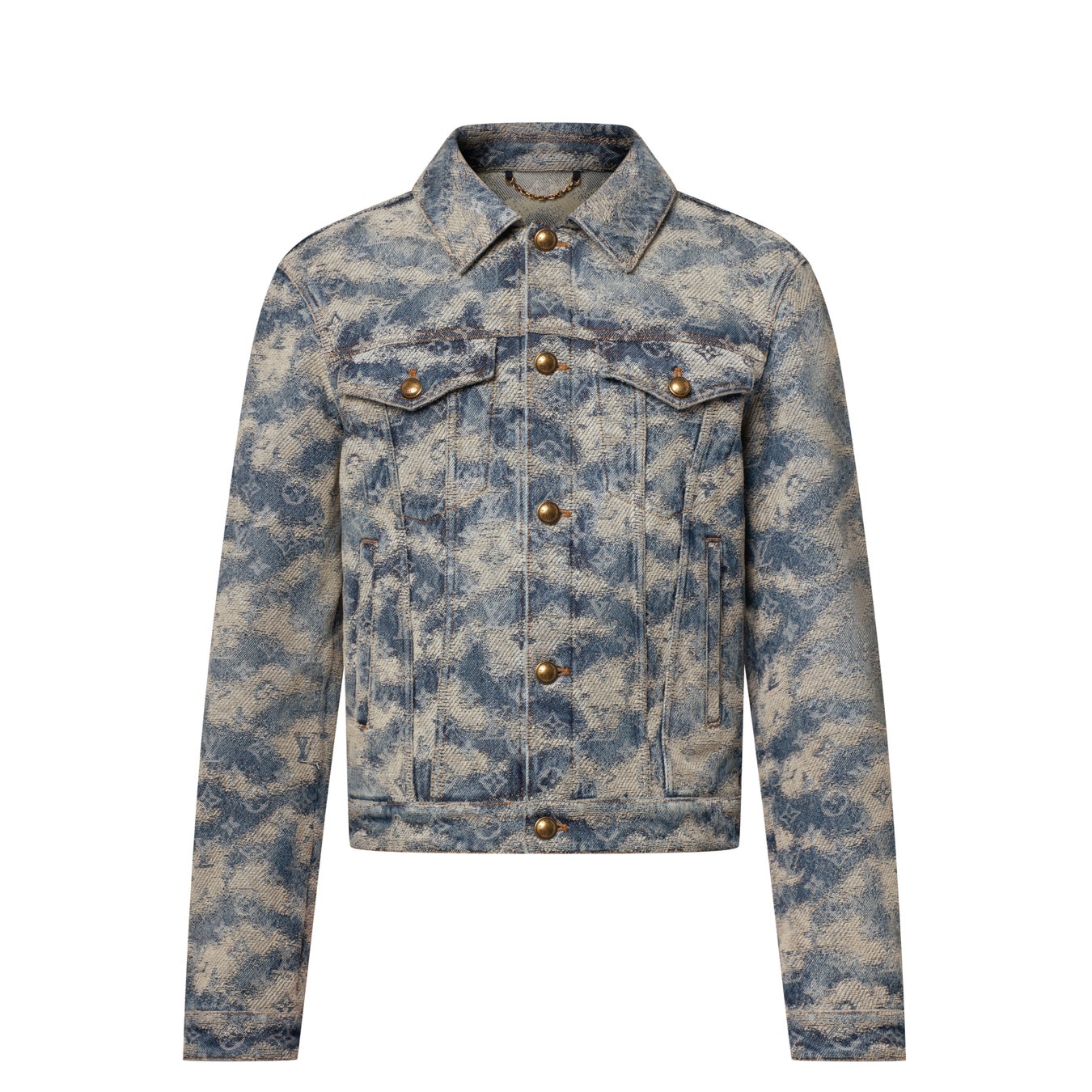 英国のカントリーサイドに漂う霧やもやから着想を得て、精緻に仕立てられたデニムトラッカージャケット。インディゴのファブリックにフォギー·モノグラム ジャカードをあしらい、雲のようなブリーチ加工のシグネチャーを織り交ぜることで、タペストリーのような表情を演出しました。ヌメ革の色合いで仕上げたダミエのジャクロンパッチがシックなアクセントをプラス。揃いのスケートパンツと合わせれば、存在感溢れるセットアップスタイルが完成します。