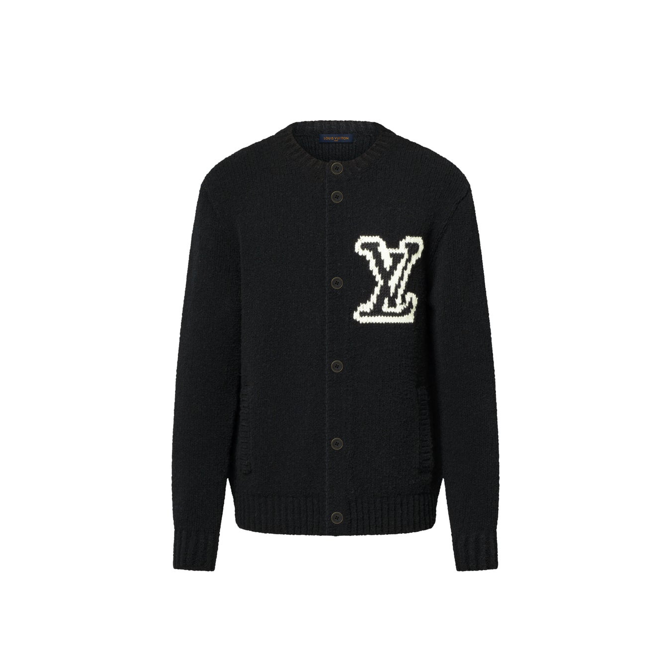 コンテンポラリーなノーカラーのカーディガン。チャンキーなブラックのヤーンを温かみのある手編みのような風合いに仕上げ、週末の装いにも最適なリラックス感溢れるスタイルを演出しました。柔らかなばバージンウール混のニットに、コントラストカラーの「LV」を直接あしらい、胸元にグラフィカルなアクセントをプラス。肌寒い季節にレイヤードして楽しめる、万能なアイテム。