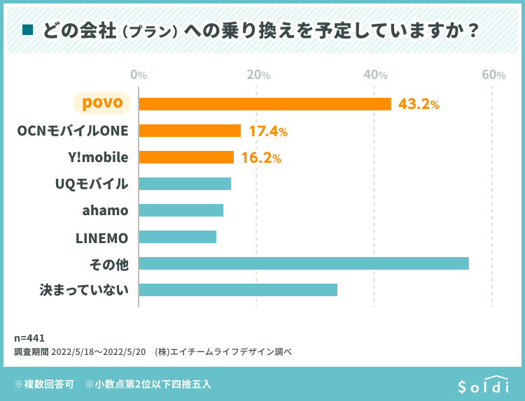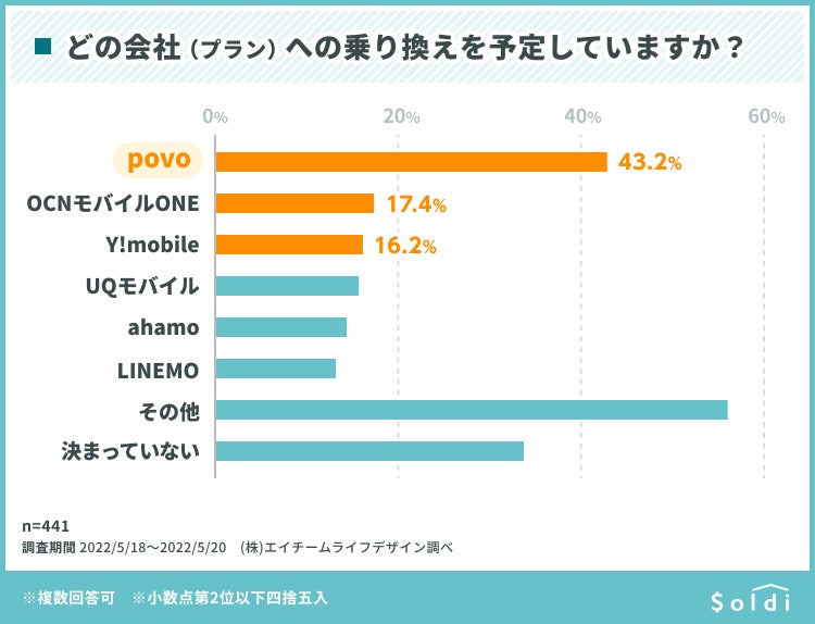 他社(プラン)への乗り換えを検討しているユーザーに乗り換えを検討している会社(プラン)を聞いたところ、KDDIの「povo」が43.2%と最も多く、次いで「まだ決まっていない」が34%、「OCNモバイルONE」が17.4%という結果になりました。