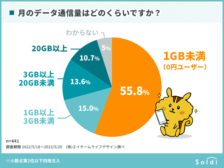今回の調査結果から、楽天モバイルユーザーのうち、およそ55.8%が月のデータ通信量1GB未満の月額0円対象ユーザーであることがわかりました。